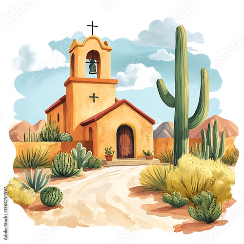 Desert Chapel A picturesque illustration of a small church nestled in an arid landscape.