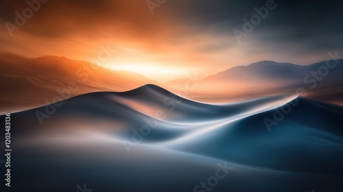 Desert Dawn, golden hues illuminating rolling dunes, gentle shadows dancing across the warm sands, serene and captivating landscape.