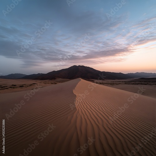 Desert dune sunrise landscape, textured sand, mountain background, travel poster