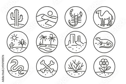 Desert Icon Collection. Line style round vector icons of Desert: Cactus, Sand Dunes, Scorpion, Camel; Sun, Oasis, Rock Formation,