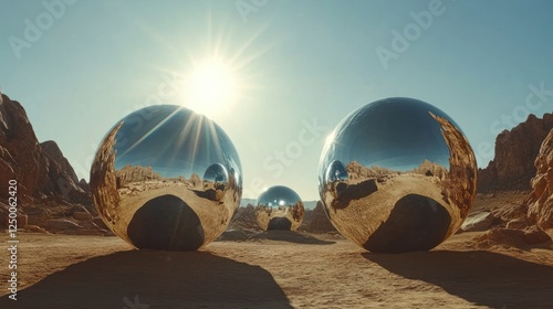 Desert landscape, chrome spheres reflecting sun, artistic installation