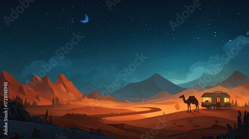 Desert landscape under starry night sky, camel near lit camper, mountains and crescent moon visible