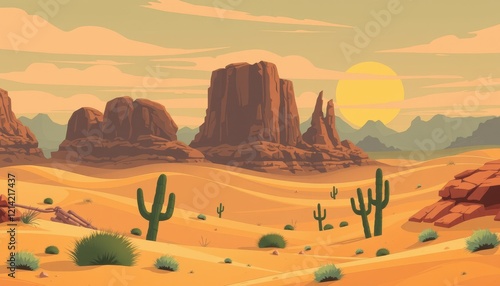 Desert Landscape with Red Rock Formations and Cacti Under a Bright Sun