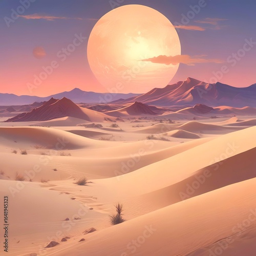 Desert landscape with sand dunes, giant moon on the horizon, clear sky.