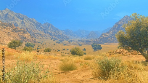 Desert Mountain Valley Landscape, Sunny Day, Empty Terrain