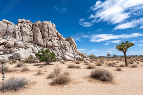 Desert Rock Formation Landscape - Majestic rock formations under a vibrant blue sky, desert landscape with shrubs and a lone Joshua tree