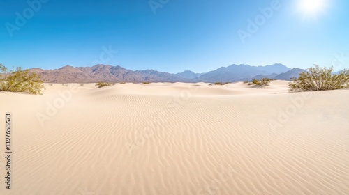 Desert Sand Dunes Sparse Vegetation Bright Sunny Landscape Wide Angle Shot Textured Surface Serenity Vista Warm Beige Tones Ideal for Travel Brochures