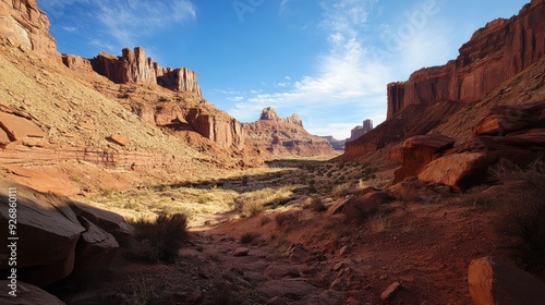 Desert scene with towering red rock formations under a bright, cloudless sky, shadows highlighting the rugged terrain