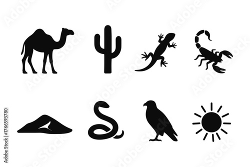 Desert silhouette icons: animals, cactus, and sun elements for nature themes