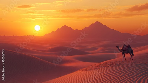 Desert sunset towering sand dunes lone oasis camel caravan warm golden hour lighting realistic 3D sand dunes soft diffused edges