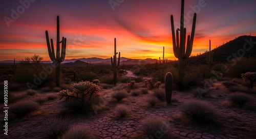 Desert Sunset with Majestic Cactus Silhouettes.
