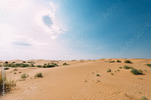 Desert with sand dunes on a clear sunny day. Desert landscape.
