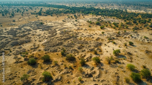 Desertification spreading across a once-green savannah, with sparse vegetation and eroded soil.