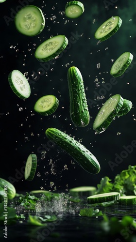 Design a dynamic advertising scene with cucumbers falling through the air against a dark background, capturing flying cucumber slices in mid-action, creating an energetic and fresh visual