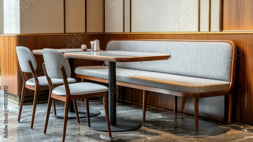 Design a minimalist dining unit for a restaurant, featuring a curved-back bench and a rectangular table. Merge Victorian aesthetics, such as elegant wood carving and soft cushions,