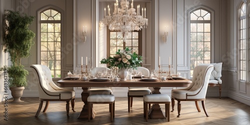 Design a traditional and elegant dining room with a wooden table, upholstered chairs, and a crystal chandelier. AI Generative