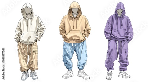 Design drawings of three different men's styles, featuring hoodies and jackets in light colors with baggy pants underneath