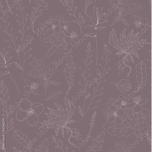 Design for fabric. Botanical pattern.Vector seamless pattern with plants on a gray background