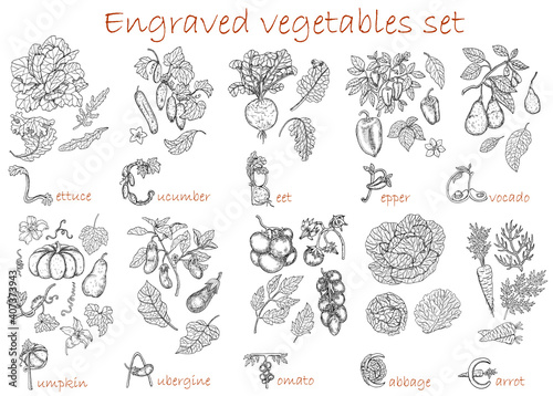 Design set with vegetables botanical collection isolated on white. Hand drawn engraved vector illustration, black and white line art, healthy eating, vegan and vegetarian concept.