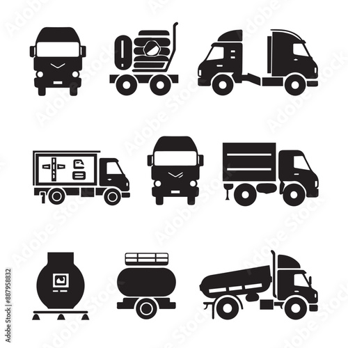 Design very stylish black pictograms that represent truck items icon set.flat. Simple. White background
