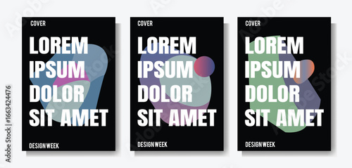 Design Week. Music. Cover. A set of three modern minimalist vector poster templates with gradient shapes on a black background for a creative event, a magazine cover, or a club flyer.