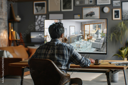 Designer at a desk, intensely focused, adjusting 3D room layout on a large monitor