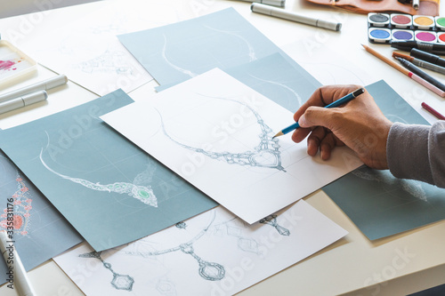 Designer design diamond jewelry drawing sketches making works craft unique handmade luxury necklaces product ideas.