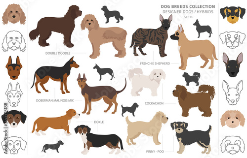 Designer dogs, crossbreed, hybrid mix pooches collection isolated on white. Flat style clipart dog set
