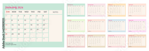 Desk calendar 2024 with minimal design and colorful monthly pages. week start on sunday. use as planner, business template , schedule, etc.