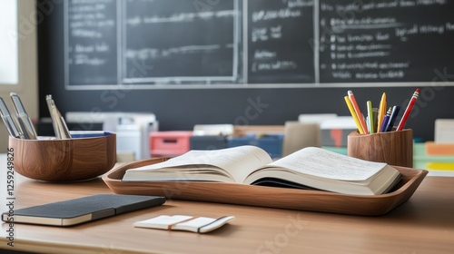 Desk, classroom, book, stationery, learning, wood, tray, organized, background, education