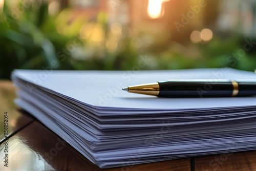 Desk with a stack of blank papers and a pen on a sunny day in a garden setting