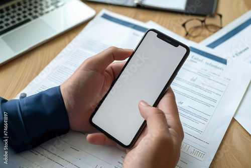 Desk with business documents and hands holding phone mockup
