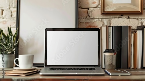 Desk with laptop, blank white screen, books, coffee cup, and picture frame on wooden table