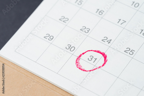 Desktop calendar with red circle on last day, 31 important resignation date, end of month, reminder and schedule or project plan launch date concept