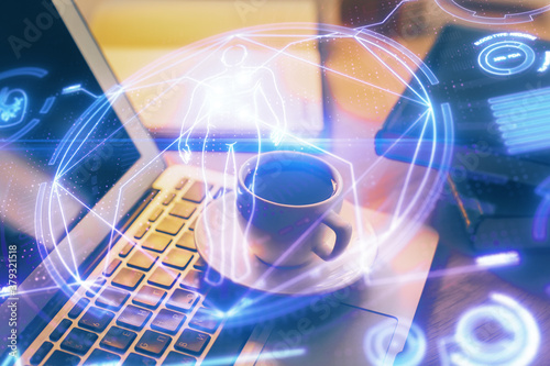 Desktop computer background and education theme drawing. Double exposure. Study concept.