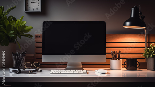 Desktop computer on wooden desk with black desk lamp keyboard mouse coffee cup glasses and potted plants in dark office setting