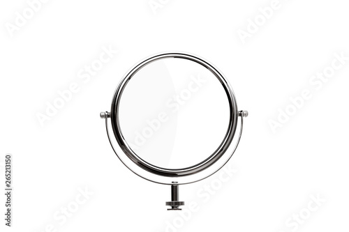 Desktop make up cosmetic mirror isolated on white back. Round turning small mirror in a metal frame.