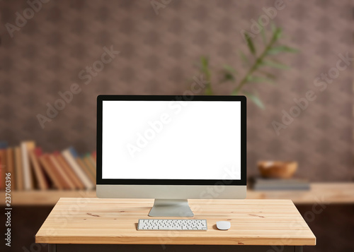 Desktop screen on the wooden desk, bookcase background room.