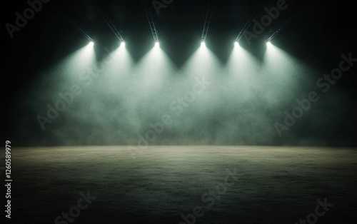Desolate Arena Under Dramatic Lighting: A high-angle, cinematic shot of an empty dirt arena, filled with thick smoke and floating dust particles.
