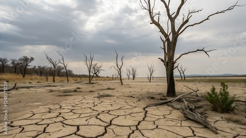 Desolate desert landscape with a dead tree and cracked dry earth