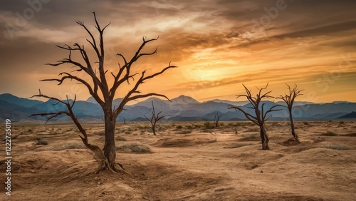 Desolate landscape of dry cracked earth with silhouetted barren trees against a dramatic sunset sky in warm orange and cool blue tones.