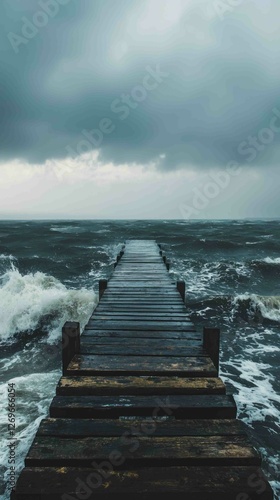 Desolate Pier Stretching Into Windy Stormy Sea Under Dark Clouds