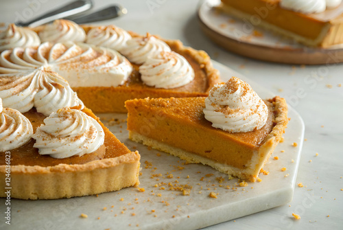 Dessert Pastries & Pies, A delicious pumpkin pie with whipped cream topping, sliced and served on a marble platter, ideal for fall celebrations and festive gatherings.