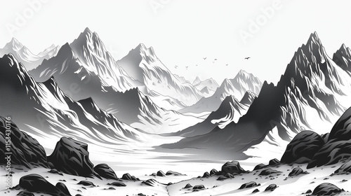 Dessin en noir et blanc d'un panorama de montagnes et reliefs vallonnés rocheux, paysage montagne champêtre et sauvage avec cratères