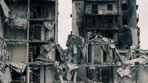 destroyed and burned houses in the city in Ukraine