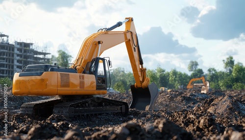 Destruction of wetlands for urban development, heavy machinery clearing the land, 3D illustration