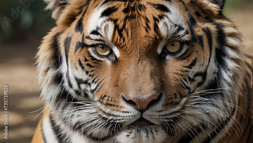 Detail a captivating Majestic Tiger Portrait, emphasizing intense eyes and distinctive stripes. Utilize natural light to heighten the tiger's majestic presence in its habitat. AI Generated.