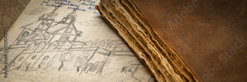 detail from a 1970s vintage travel journal with handwriting and pencil sketches (property release attached) and a retro leather-bound diary, panoramic banner