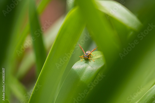 Detail macro shot of wasp standing on a leaf outdoor