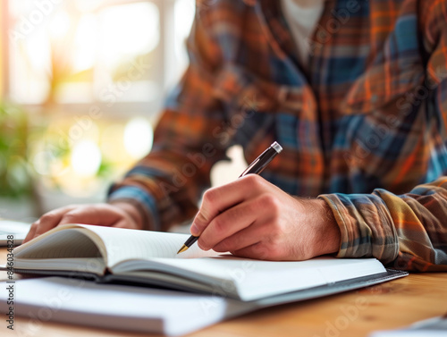 Detail of a man's hand writing with his left hand.